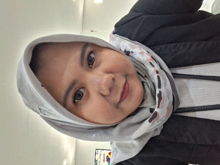 A person wearing a light gray hijab with subtle pink and black patterns looks directly at the camera. She is also wearing a black jacket over a white striped shirt. The background is a blurry white wall with what appears to be a colorful poster near the bottom of the frame. The lighting is bright and even.