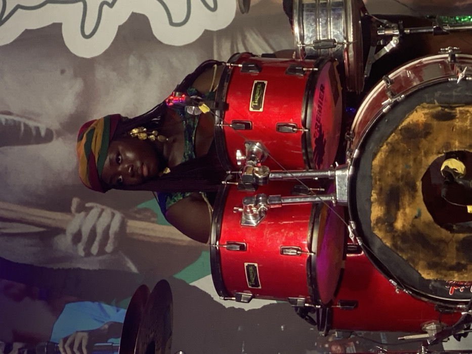 - "A performer with a multicolored headwrap and large gold earrings is positioned behind a set of red Premier drums" by FM-V51a13, licensed under CC BY 4.0