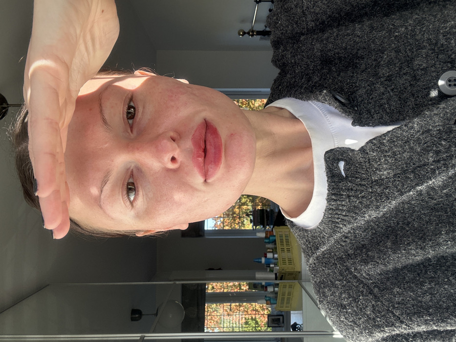 The scene depicts an adult female subject indoors, located within the city of Wealden, United Kingdom. She is positioned centrally, facing forward, with her right hand raised to her forehead, shielding her eyes from bright natural light originating from the left. Her skin exhibits freckles and some redness on the cheeks, and her lips are colored with a deep pink or red pigment. She wears a white crew-neck t-shirt underneath a dark grey, textured knit cardigan with visible dark buttons. The background on the left features a large reflective surface, likely a mirror, which reflects a room with a window displaying autumnal trees with orange foliage. Below this reflected window, a light yellow crate holds various toiletries and bottles. A dark ceiling light fixture is also visible in the reflection. To the right, a window or opening shows more autumnal trees, and a dark metal headboard of a bed is partially visible on the far right edge. The environment is illuminated by strong, direct natural light, suggesting a daytime setting within a domestic interior.