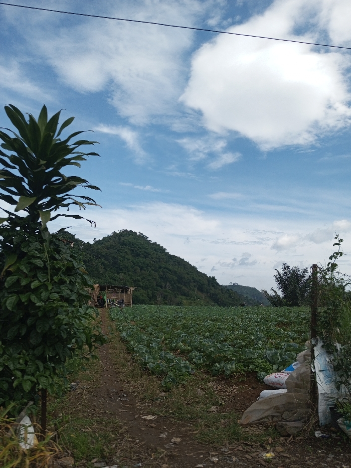 The image displays an agricultural landscape in Ariyalai, Sri Lanka, under a bright blue sky with scattered white and cirrus clouds, including one prominent cumulus cloud on the upper right. A thin black line, possibly a utility wire, stretches horizontally across the top of the frame. In the left foreground, a tall, upright plant with large, sword-shaped green leaves stands prominently. A narrow, unpaved dirt path runs from the immediate foreground towards the middle distance, bordered on its right by a large cultivated field. This field is densely planted with numerous green, leafy crops, consistent with cabbage or similar brassica, extending towards the base of a large, heavily forested mountain that dominates the background. At the far end of the dirt path, near the base of the mountain and at the edge of the field, a rustic, open-sided structure, likely a shelter or shed, is visible, constructed from wood or bamboo with a simple roof. Two motorcycles are parked next to this structure. In the lower right foreground, a wooden post is partially obscured by foliage, with several white sacks, possibly containing fertilizer, stacked on the ground nearby. Additional smaller, forested hills are visible in the distant background to the right of the main mountain. No human figures are discernible, and no active interactions or actions are depicted.