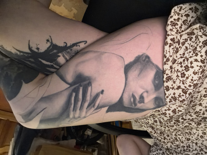 A close-up photograph shows the legs and lower torso of an individual, seated indoors. The person is wearing a light-colored dress with a brown, small-scale floral pattern. Extensive black and grey tattoos cover the visible skin of the legs. The left upper thigh features a large, realistic portrait tattoo of a woman's face, depicted looking upwards, with dark hair. Adjacent to this, a tattooed hand with dark nail polish is shown resting near the woman's shoulder or collarbone area. Below this main portrait, on the lower thigh, a darker, abstract tattoo with sharp, spattered elements is visible. Faint, light-colored outlines are present on the bare skin, suggesting potential further tattoo work. A black chair armrest is partially visible on the left. The background is blurred, indicating an indoor setting with indistinct elements including a wooden surface and a dark, unidentifiable object, possibly a bicycle. The specific location within the city of Chaikovsky, Russia, cannot be determined from the visual evidence presented.