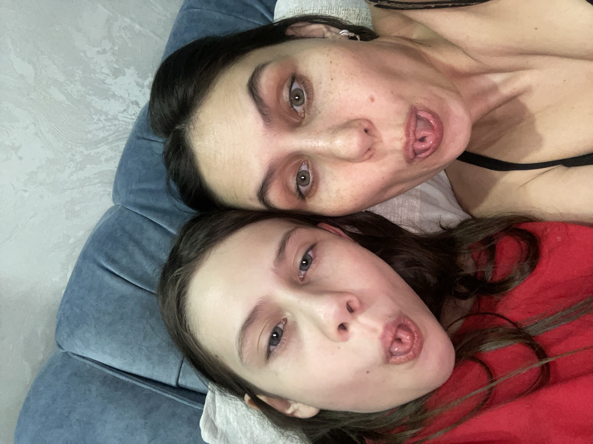 Two people, possibly a mother and daughter, are lying side by side on a blue upholstered surface. Both are sticking out their tongues. The woman is wearing a black top. The younger person is wearing a red top. The location is not discernible, and there is no evidence to suggest the location is in Izhevsk, Russia.