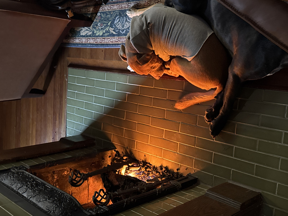 - "A dog wearing a light gray shirt curls up beside a fireplace with burning logs" by FM-IdNfF2, licensed under CC BY 4.0