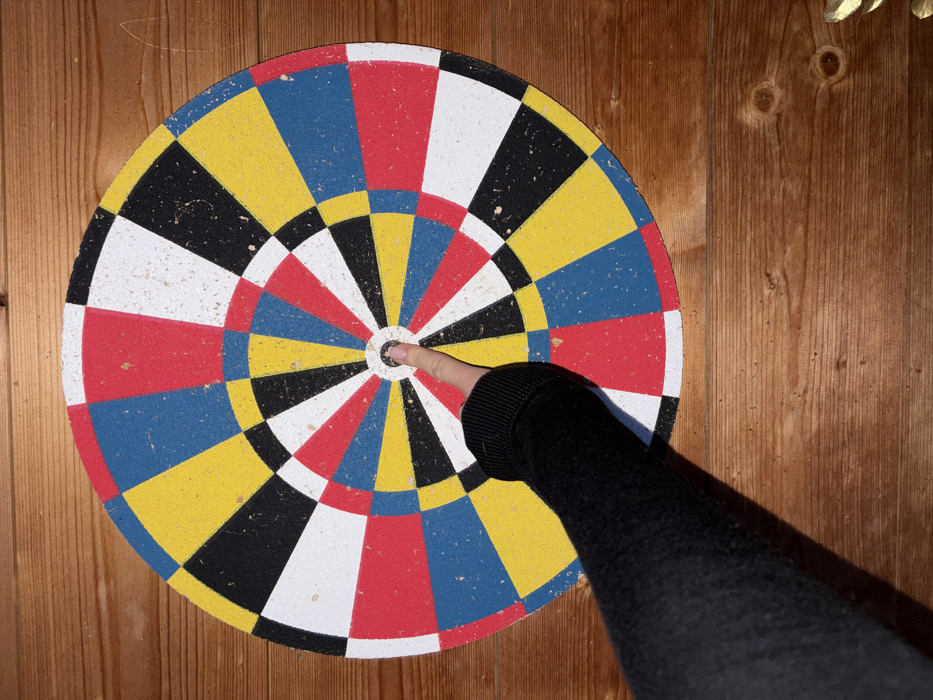 - "A circular dartboard, composed of concentric rings and radial segments in red, blue, yellow, black, and white, is mounted on a wooden plank wall" by FM-OtwjV2, licensed under CC BY 4.0