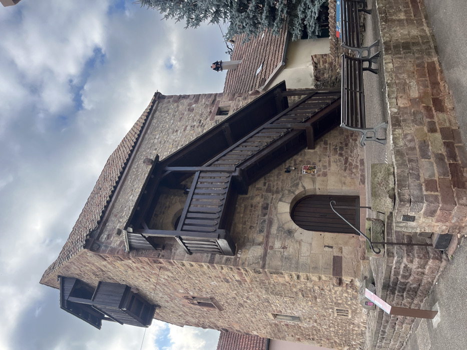The image displays a multi-story stone building identified as the Romanesque House (Maison Romane) in Rosheim, France, under an overcast sky with scattered clouds. The primary structure is constructed from reddish-brown, hewn stone blocks and features a steeply pitched roof covered with overlapping terracotta tiles. A small, enclosed wooden balcony with its own tiled roof projects from the upper left corner of the building. Below it, a larger, open wooden balcony with dark wooden railings extends from the mid-section of the facade. A dark wooden staircase, also equipped with wooden railings, ascends diagonally from the ground level to this larger balcony. At the base of the building, an arched entryway contains a dark wooden plank door. A small black metal handrail leads to this door. A rectangular plaque with colored graphics is affixed to the stone wall immediately to the right of the door, below a wall-mounted light fixture. To the right of the building, on a raised platform constructed of similar stone blocks, are two dark metal-framed benches with wooden slats. One bench has a blue informational sign attached to its backrest. Two rough-hewn stone planters are positioned on the ground level near the building's base. An information stand with a light-colored panel is visible on the far left. The immediate foreground consists of a grey paved surface and a low stone retaining wall. In the background to the right, a lower building with a terracotta-tiled roof and a chimney is partially visible, obscured by a tall, blue-green coniferous tree.