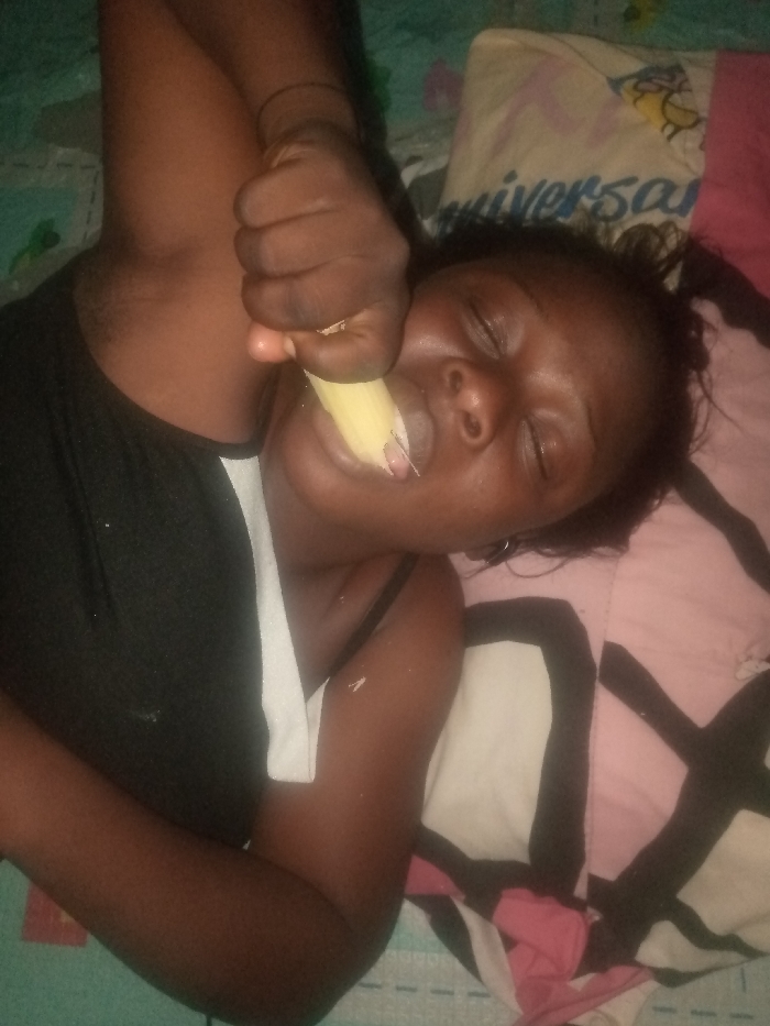 A woman with dark skin lies on a patterned bed with closed eyes. She wears a black tank top with a white stripe. She holds a peeled banana up to her mouth with her fist, seemingly eating it. Her hair is dark, and she wears small hoop earrings. The bedding has various patterns, including pink, white, and black designs.