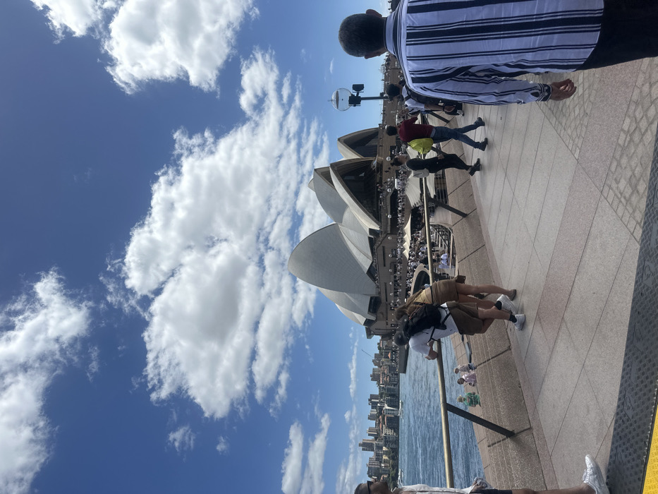 The Sydney Opera House stands against a bright blue sky with fluffy white clouds. A crowd of people gather around the landmark. Some are walking along the paved area, while others are posing for pictures. A body of water and a cityscape are visible in the background. Several people are positioned in the foreground, some facing away from the camera, engaging with the scenery.