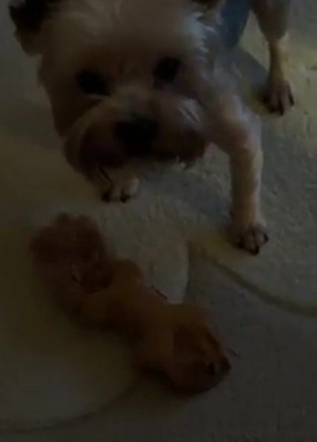 small Yorkshire Terrier dog standing on a light-colored carpet. In front of it is a small, plush, brown squirrel toy. A person's hand reaches in and picks up the toy. The dog jumps up towards the hand, then the hand drops the toy onto a white surface with a flower pattern.