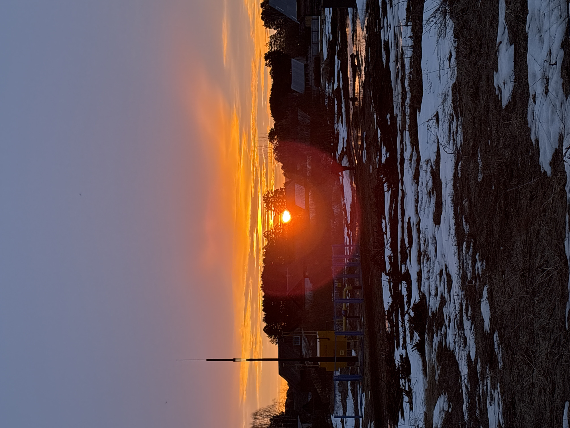 The image depicts a sunset scene in a location that appears to be near or within a rural area, possibly Rusalevka, Russia. The sun is setting near the horizon, casting an orange glow across the sky. Below the horizon, there are outlines of trees and structures, including what appears to be a building. In the foreground, there are partially snow-covered patches of land and vegetation. A slender, vertical structure, possibly a tower or pole, is visible, with what looks like some industrial or infrastructural apparatus around it. The environment suggests a transition between winter and spring, indicated by the melting snow. No people are directly visible in the frame.