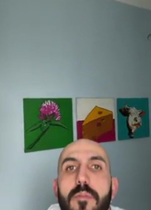 bald man with a beard wearing a white t-shirt, looking directly at the camera. Behind him, on a light blue wall, are three square paintings hanging side by side. From left to right, the paintings depict a pink clover on a green background, a slice of Swiss cheese on a white background with a red border, and a cow's head on a turquoise background. The man is standing indoors.