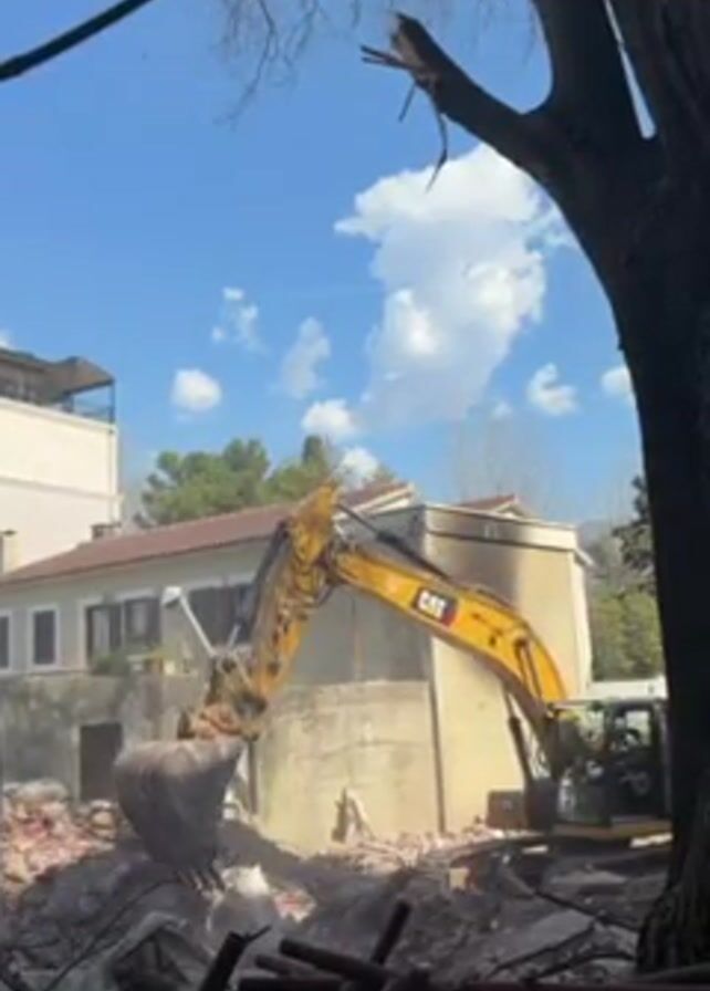 The scene depicts a yellow CAT excavator demolishing a building on a sunny day. The excavator's large bucket is actively scooping up rubble and debris from the building's ruins. A large tree with bare branches frames the foreground, obscuring portions of the demolition site. In the background, a multi-story building is visible, along with trees and a partly cloudy blue sky. The camera angle is low, looking up towards the excavator and the building it's demolishing.
