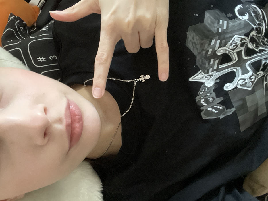 A close-up image depicts the lower portion of a fair-skinned individual's face, including the nose, mouth, and chin, angled slightly upwards. The individual's lips are slightly parted and appear moisturized. A silver-colored chain necklace with a small, ornate silver cross pendant rests on the person's neck. The individual is wearing a black t-shirt featuring a multi-component graphic design; visible elements include stylized, intricate grey crosses and pixelated, blocky grey figures resembling the "Wither" mob from Minecraft. A right hand, positioned to the right of the person's neck, displays a "rock and roll" gesture with the index and pinky fingers extended. A white, fluffy material, possibly a pillow or clothing trim, is visible on the left, near the person's head. The background on the right shows dark fabric with a white, abstract pattern, including the character "#3". The scene is indoors. Visual information within the image does not provide specific details to identify a location within the city of Saint Petersburg, Russia.