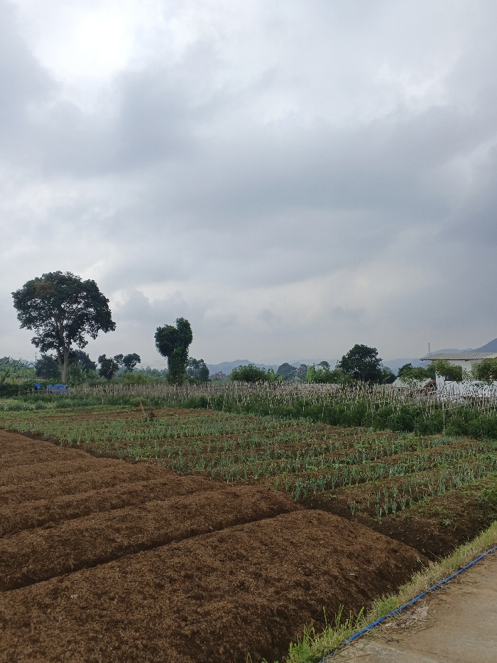 Under a gray, cloudy sky, a cultivated field presents two distinct sections. The foreground features rows of freshly tilled, dark brown soil. Adjacent to it, the second section displays rows of green plants, possibly young crops. Scattered trees punctuate the horizon, including a large, solitary tree on the left. A fence-like structure is visible in the middle ground. Mountains are vaguely discernible in the distance, and a building is situated on the right. The overall impression is that of a rural agricultural landscape under overcast conditions.
