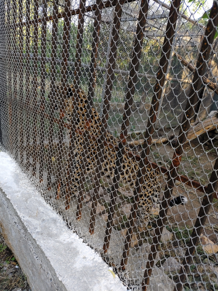 - "This image depicts a leopard partially visible through a wire mesh fence within an outdoor enclosure, located in Saidpur, Pakistan" by FM-uPtwu2, licensed under CC BY 4.0
