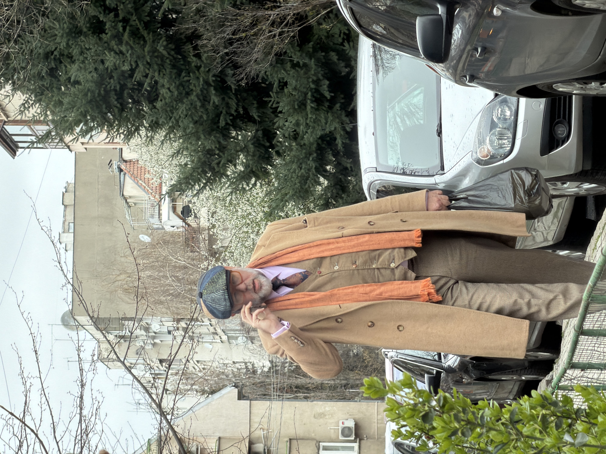 The image depicts a man in a light brown suit, orange scarf, and newsboy cap, holding a black plastic bag near parked cars. The setting appears to be an urban street, evidenced by the presence of buildings, trees, and possibly utility poles in the background. The location is identified as Sofia, Bulgaria.