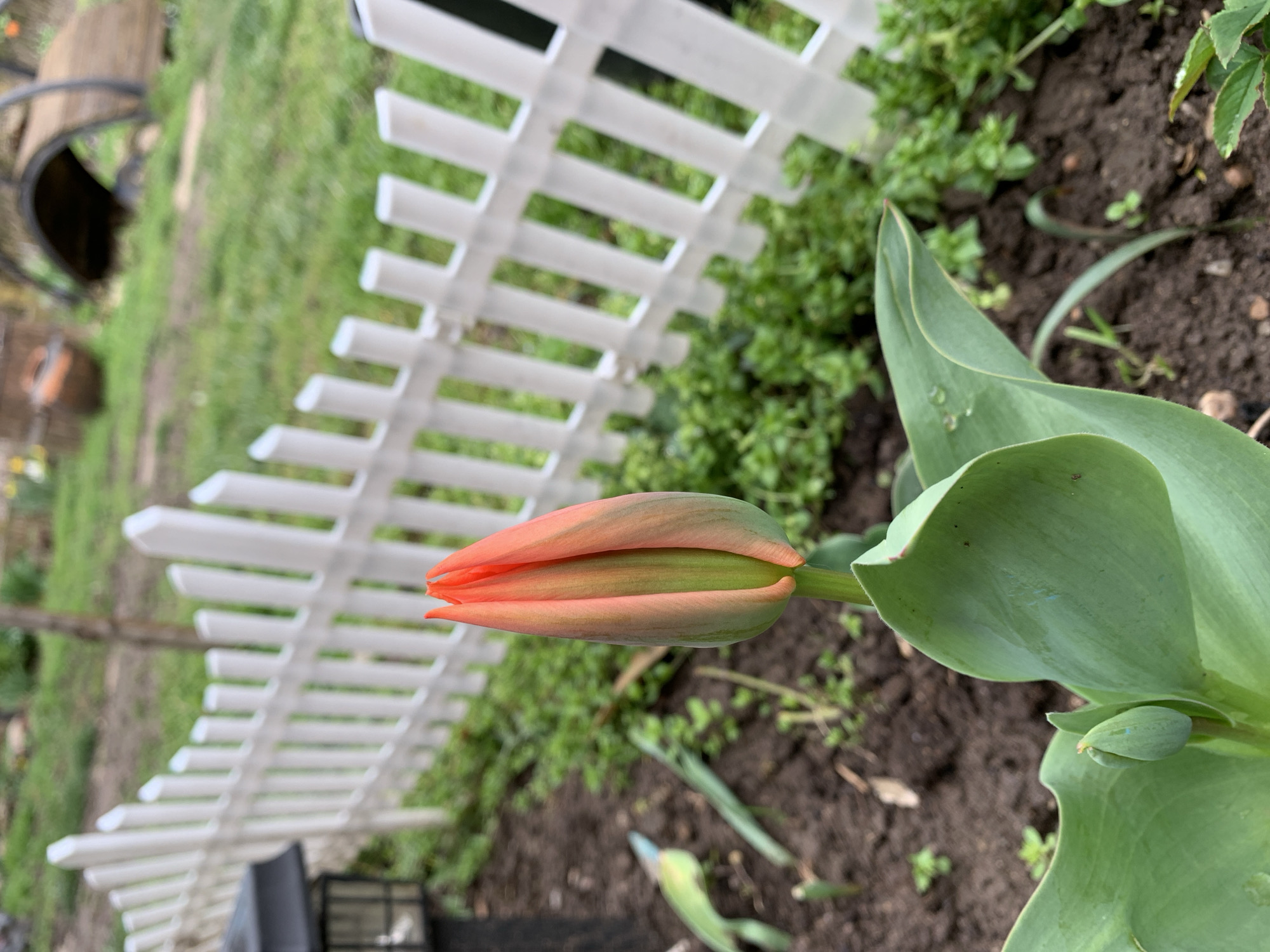 A close-up, slightly rotated image features a tulip bud with orange and green hues, positioned in front of a white picket fence