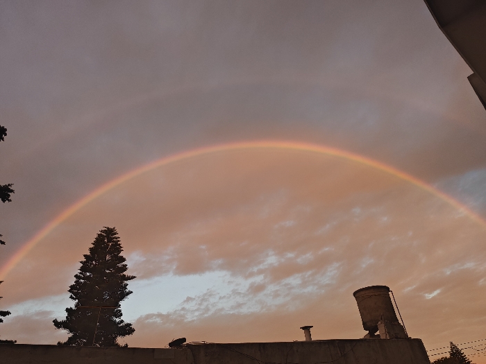 The image depicts an elevated view of an urban scene in La Plata, Argentina, at either sunrise or sunset. A prominent primary rainbow, displaying its full color spectrum, arches across the sky from the lower left to the lower right of the frame. A fainter, secondary rainbow is discernible above the primary arc. The sky consists of a mix of orange, pink, and grey stratiform clouds. The foreground features a flat, light-colored rooftop. On the left, a tall, dark conifer tree, likely a cypress or pine, rises above the rooftop line, its upper foliage silhouetted against the sky and partially intersecting the rainbow's base. In the upper left corner, dark branches of another tree are visible. On the right side of the rooftop, a large, light-colored, cylindrical water tank with a conical top is present, supported by visible structures. To the immediate left of the water tank, a white vent pipe or small chimney stack protrudes from the rooftop. Minor building elements and faint lines, possibly wires or conduits, are visible on the rooftop surface.
