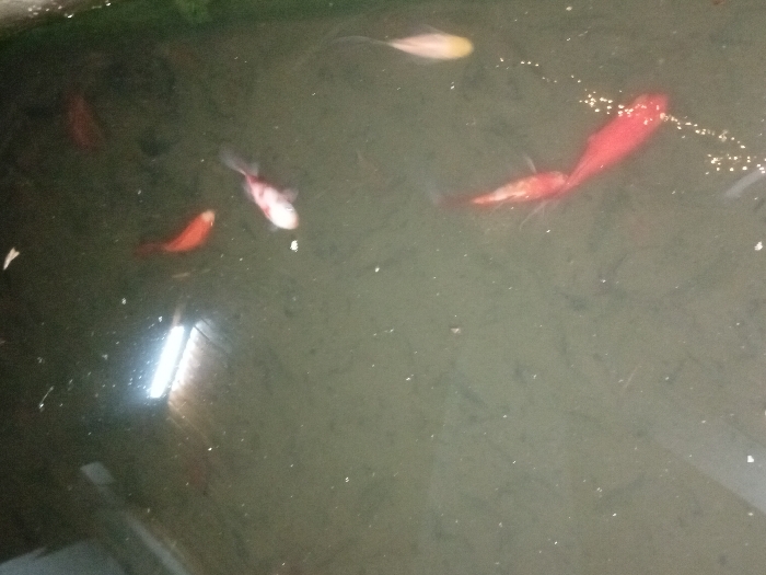 A pond or tank contains several goldfish of varying colors, including red, white, and gold. The water is murky, obscuring the bottom and suggesting a lack of filtration. There is evidence of fish food scattered on the surface. A light reflects off the water, creating a bright spot in the lower-left corner. The composition captures a scene of captive aquatic life in a somewhat unkempt environment.