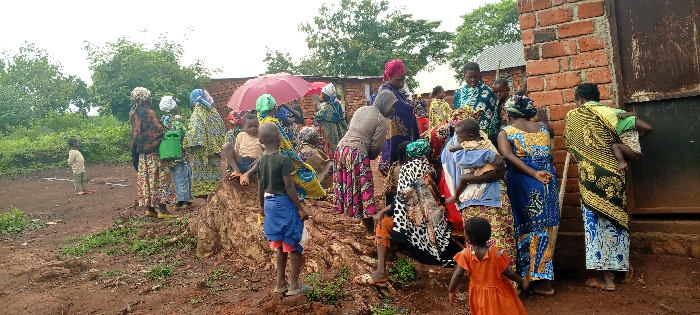 A group of women and children are gathered outside next to a brick building. Most are wearing colorful patterned clothing and head coverings, some carrying babies. One woman holds a pink umbrella. Some children are sitting on a dirt mound. A young child stands apart on the reddish-brown ground. Trees and foliage surround the area. The sky is overcast.
