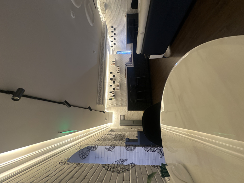 The room features white brick walls adorned with intricate black and white patterns. A black track lighting fixture stretches across the upper wall. A long counter with black bar stools is visible, behind which shelves display various products. In the upper corner, a blue bench with white accents sits on a wooden floor. A large, white, round table dominates the foreground, partially obscuring a black chair.