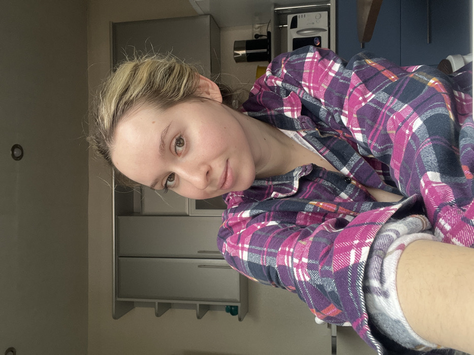 A single female subject is depicted in a medium-close-up selfie, positioned in a residential kitchen. She appears to be a young adult with light skin, brown eyes, and light brown hair pulled back from her face. She has a subtle smile and looks directly into the camera. The subject is wearing a long-sleeved plaid shirt patterned with magenta, dark blue, and white. The cuff of her visible left sleeve is rolled, exposing an internal plaid pattern of white, grey, and light pink. The background features a kitchen environment with light grey wall-mounted cabinets and curved open shelving units on the left. A small teal object rests on the lowest open shelf. To the right, a white microwave oven is situated on a shelf, with a black coffee maker and a yellow cylindrical object on the countertop above it. A dark blue cabinet or drawer front is visible below the counter, and the edge of a wooden table is present in the lower right of the frame. The ceiling is light-colored and contains two recessed circular light fixtures. The specific location within Minsk, Belarus, cannot be visually determined from the image.