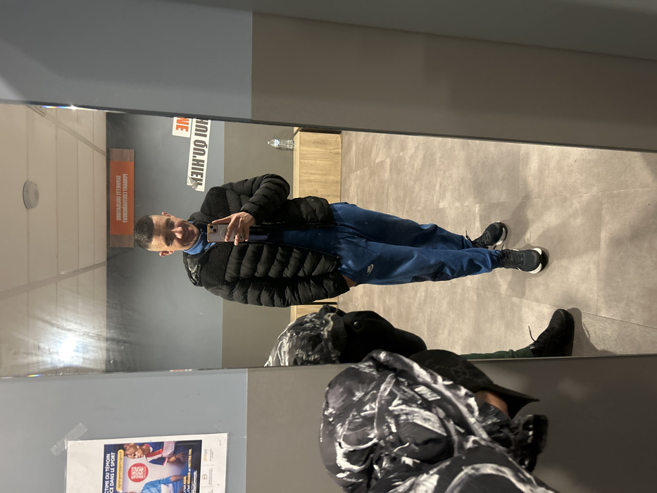 A man in a black puffer jacket and blue sweatpants stands in front of a mirror, taking a selfie. The mirror reflects the scene, including a glimpse of another person in a patterned coat and a poster with text related to sports. The background features a wall with a sign and a water bottle on a shelf. The floor is tiled, and the lighting is fluorescent.