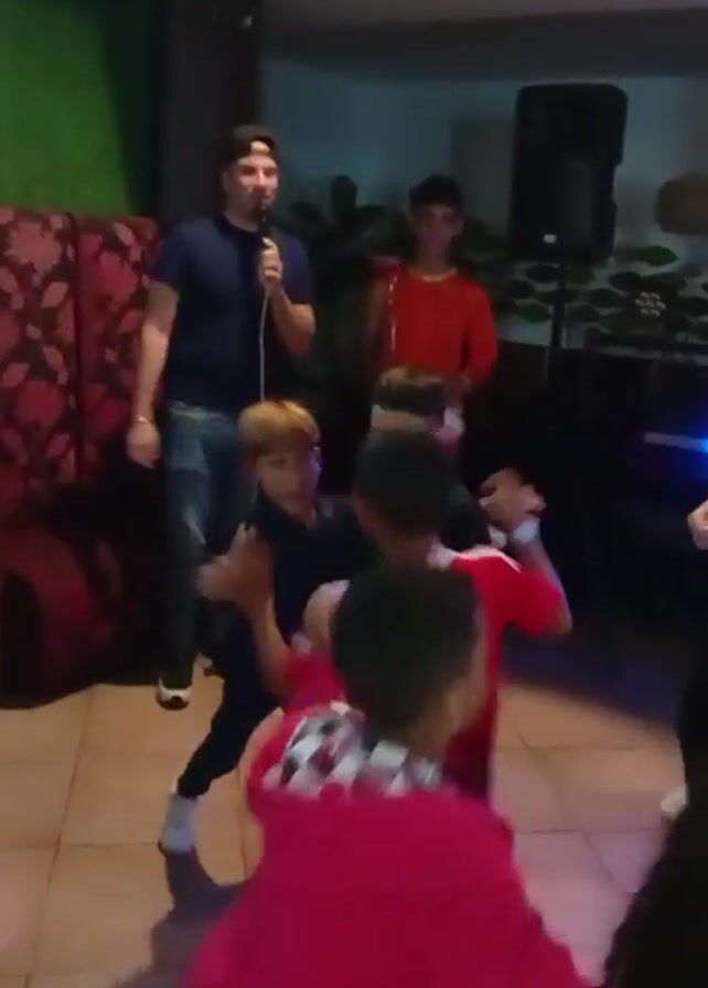 A group of young children participate in a game at a party. The children are dancing and hugging. A man stands in the background, talking on a microphone. Another person stands near a speaker in the background. The party appears to be in a restaurant or banquet hall. The environment is dimly lit with colored party lights.