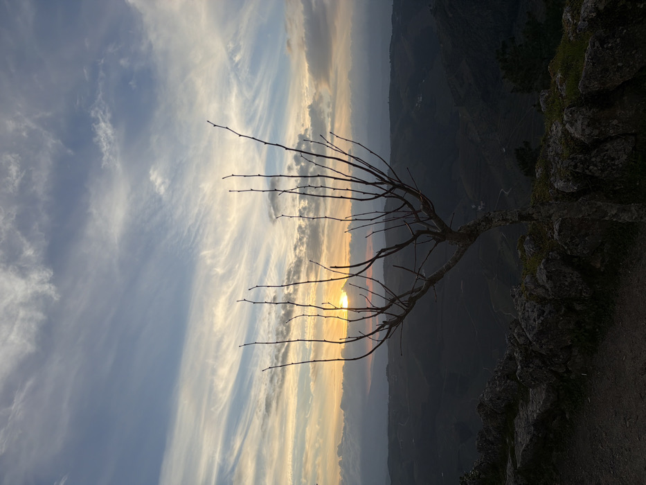 The image depicts a sunset over the terraced landscape of the Douro Valley, specifically from an elevated viewpoint within or near Peso da Régua, Portugal. In the foreground, a low, weathered stone wall composed of various sized rocks runs horizontally across the bottom third of the frame. Below the wall, a dark, unpaved ground surface is visible. A leafless, deciduous tree, possibly a dormant fruit tree or vine, stands prominently in the midground, slightly right of center. Its multiple thin, upward-reaching branches are silhouetted against the bright horizon. The tree's trunk is gnarled and appears to have lichen or moss on its lower section. The background reveals a vast, undulating valley, characterized by dark green or brown terraced hillsides, indicative of vineyards. These hills extend into the distance, gradually fading into a hazy, muted blue-grey. A faint winding road or path can be discerned within the valley. The sky occupies the upper two-thirds of the image, showcasing a dramatic sunset. The sun, a brilliant orange-yellow orb, is partially obscured by a low band of dark, horizontal clouds near the horizon, directly behind the tree. Above this, the sky transitions through hues of pale orange, yellow, and blue, streaked with wispy cirrus and cirrocumulus clouds that display varying patterns and densities across the expanse. The overall lighting is low, with the foreground and midground largely in silhouette, contrasting with the vibrant colors of the setting sun. There are no human figures or animals visible.