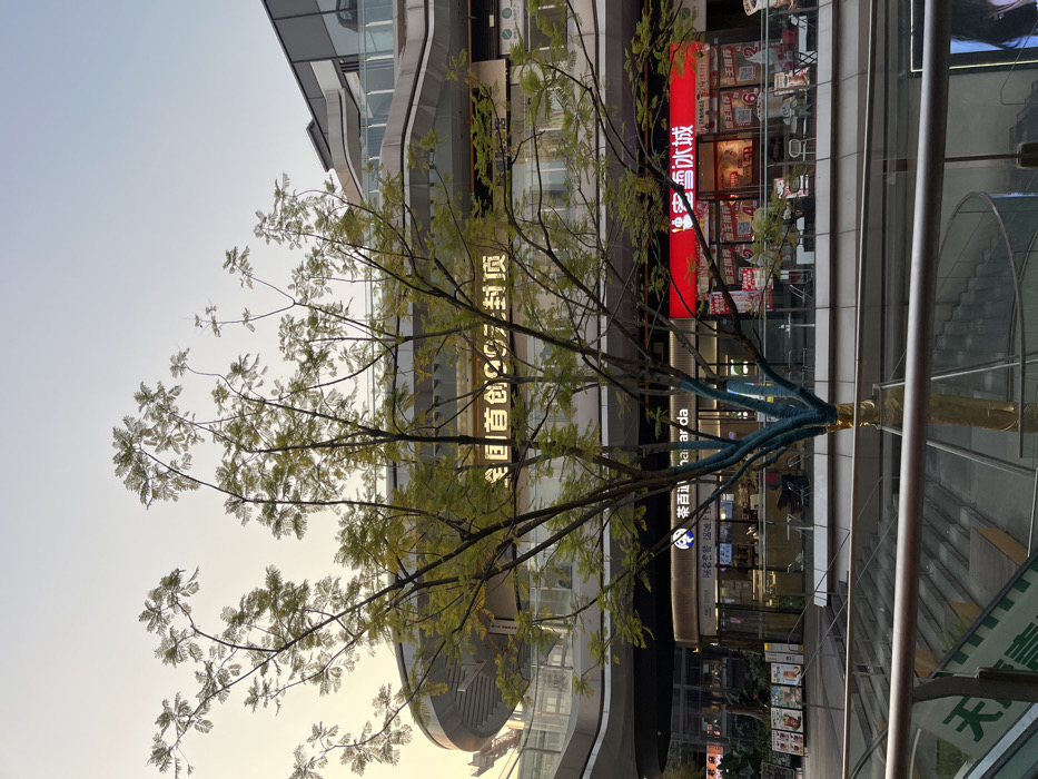 The image depicts a multi-level outdoor commercial complex in Wenjiang District, China, under an overcast or twilight sky. A deciduous tree with green foliage, its lower trunk wrapped in gold material and select branches painted light blue, dominates the center foreground. A metal railing is visible immediately in front of the viewer, with steps descending behind it to the lower left, indicating a sunken plaza or escalator access. Behind the tree, a modern, multi-story building with curved lines, glass facades, and balconies is visible. A prominent, illuminated sign on a mid-level fascia displays Chinese characters reading "全国首创99%封顶." Below this, storefronts are visible. One notable establishment is "茶百道 Chabaidao," and another prominently features a red sign with Chinese characters identifying "蜜雪冰城 Mixue Bingcheng." Several individuals are seated at outdoor tables in front of these establishments. No specific actions or interactions are discernible beyond passive occupancy. The overall environment is an urban retail setting.