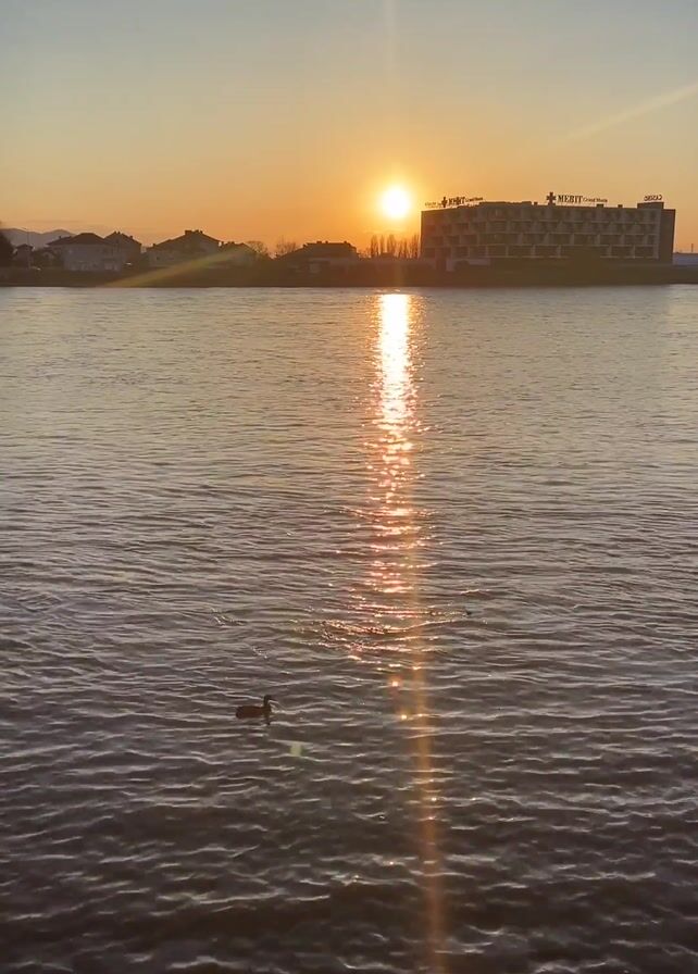 tranquil scene of a river during sunset. The sun, a bright orange orb, is setting behind buildings on the opposite shore, casting a shimmering golden reflection on the water's surface. A single duck swims across the river, its silhouette highlighted against the bright water. On the right side of the frame is a building with the name "MERIT" displayed on top, likely a hotel. To the left, there are houses on the shoreline. The sky is clear and blue, gradually fading into orange hues as it approaches the horizon. The water is rippling gently, reflecting the sunlight, and creating a sense of serenity.