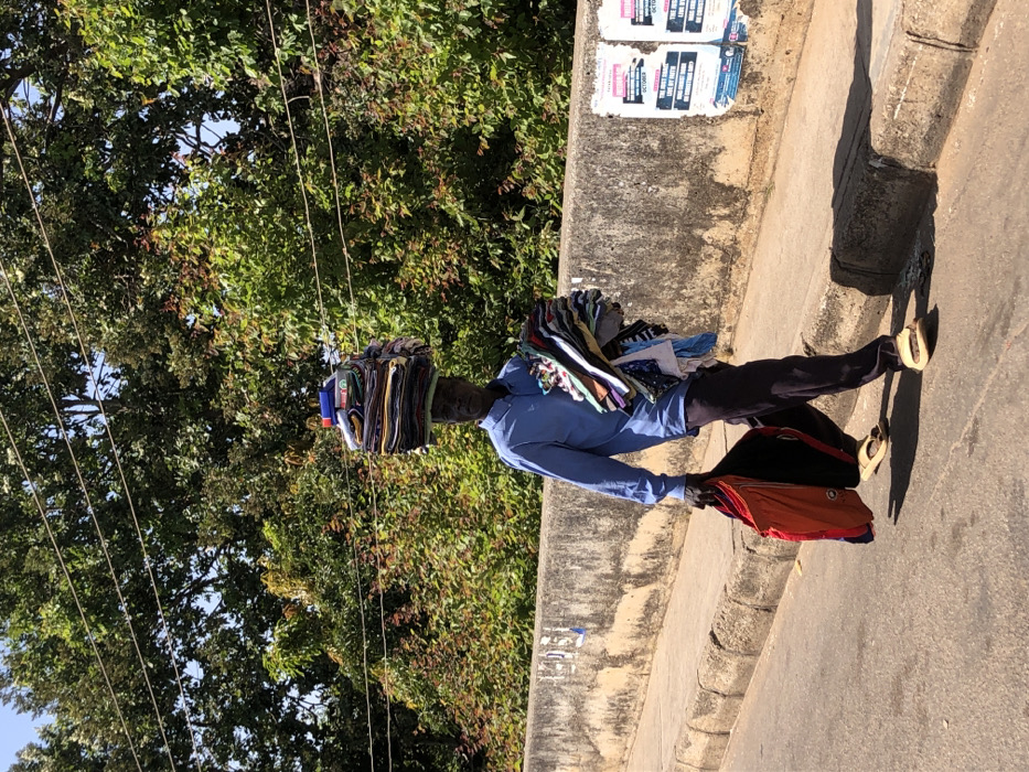 - "An African man walks along a road, carrying stacks of fabric on his head and a bag in his hand" by FM-2cWZX2, licensed under CC BY 4.0