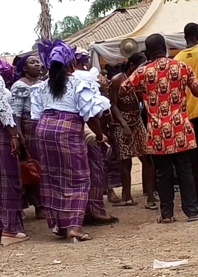 group of people gathered in an outdoor setting, likely a celebration or event. The ground appears to be a dirt or gravel surface. A group of women are wearing matching purple plaid skirts and white blouses with ruffles. They also wear matching purple headwraps. One of the women holds what appears to be a bundle of hair in her hand. Several men are among the crowd, one wearing a red shirt with a repeating lion face print. There is a white tent structure in the background, partially visible. People are talking, smiling, and interacting with each other, there is music playing. The scene suggests a cultural event or traditional gathering.