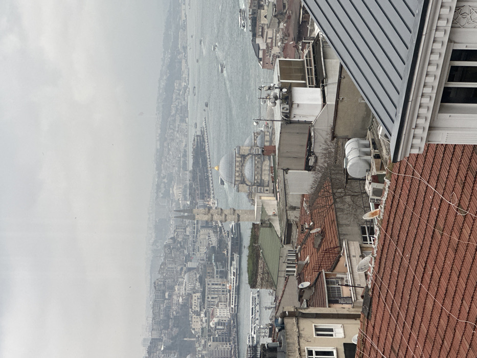 An elevated photograph displays a dense urban landscape and a waterway under an overcast sky in Istanbul, Turkey