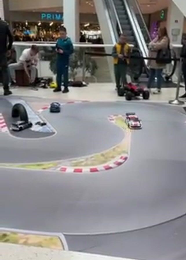 A group of people is gathered around a miniature race track set up in a shopping mall. On the track, several radio-controlled cars are racing around a gray track with red and white barriers. The course features a black tire-like tunnel obstacle. There are drivers on the sidelines using controllers, with spectators watching the race. In the background, an escalator can be seen, indicating the mall setting. The scene captures the excitement of a miniature car race in a public space.