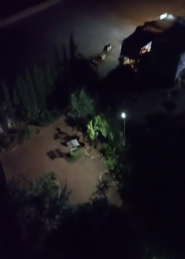 The video presents an overhead view of a small, dimly lit outdoor space at night