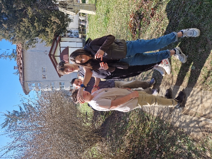 The image displays four individuals standing outdoors in the city of Troyan, Bulgaria, on a paved pathway bordered by grass and sparse foliage