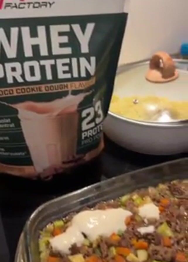 Here's a detailed description of the video: The video displays a kitchen scene, focusing on food preparation. In the foreground, there is a glass baking dish containing a mixture of ground meat and diced vegetables, zucchini and carrots. On top of the meat and vegetables are dollops of a white sauce, being added from a small brown bowl using a spoon. Behind the baking dish, there is a large bag of "Sports Factory Whey Protein" in choco cookie dough flavor. A large white pot with a transparent lid sits on the stovetop, slightly out of focus, seemingly containing couscous. The kitchen environment is clean and well-lit.