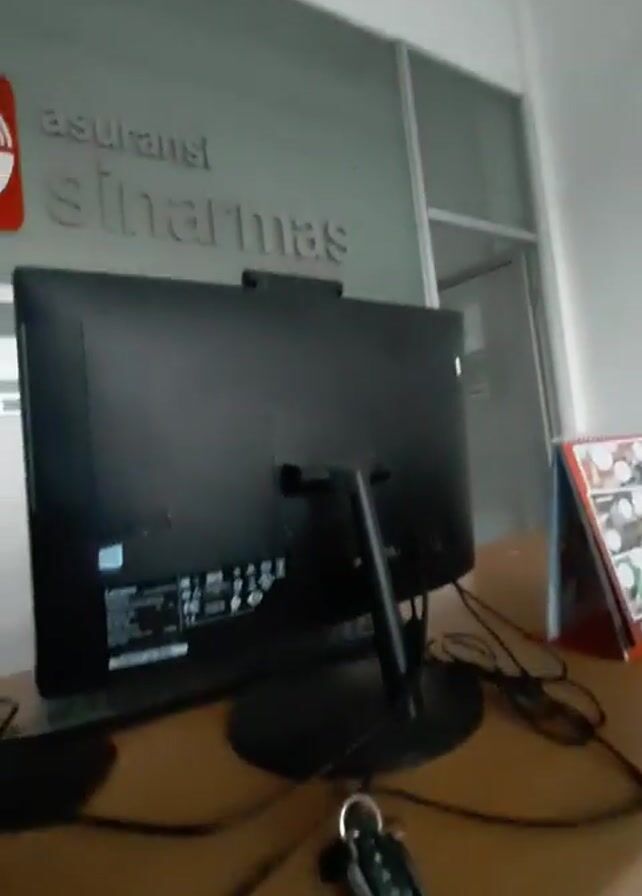 back of a computer monitor on a desk in an office. A lock sits on the desk near the monitor. A calendar is visible on the desk to the right of the monitor. Behind the monitor is a glass wall with the logo and name "asuransi sinarmas" in Indonesian. The walls and ceiling of the office are white.