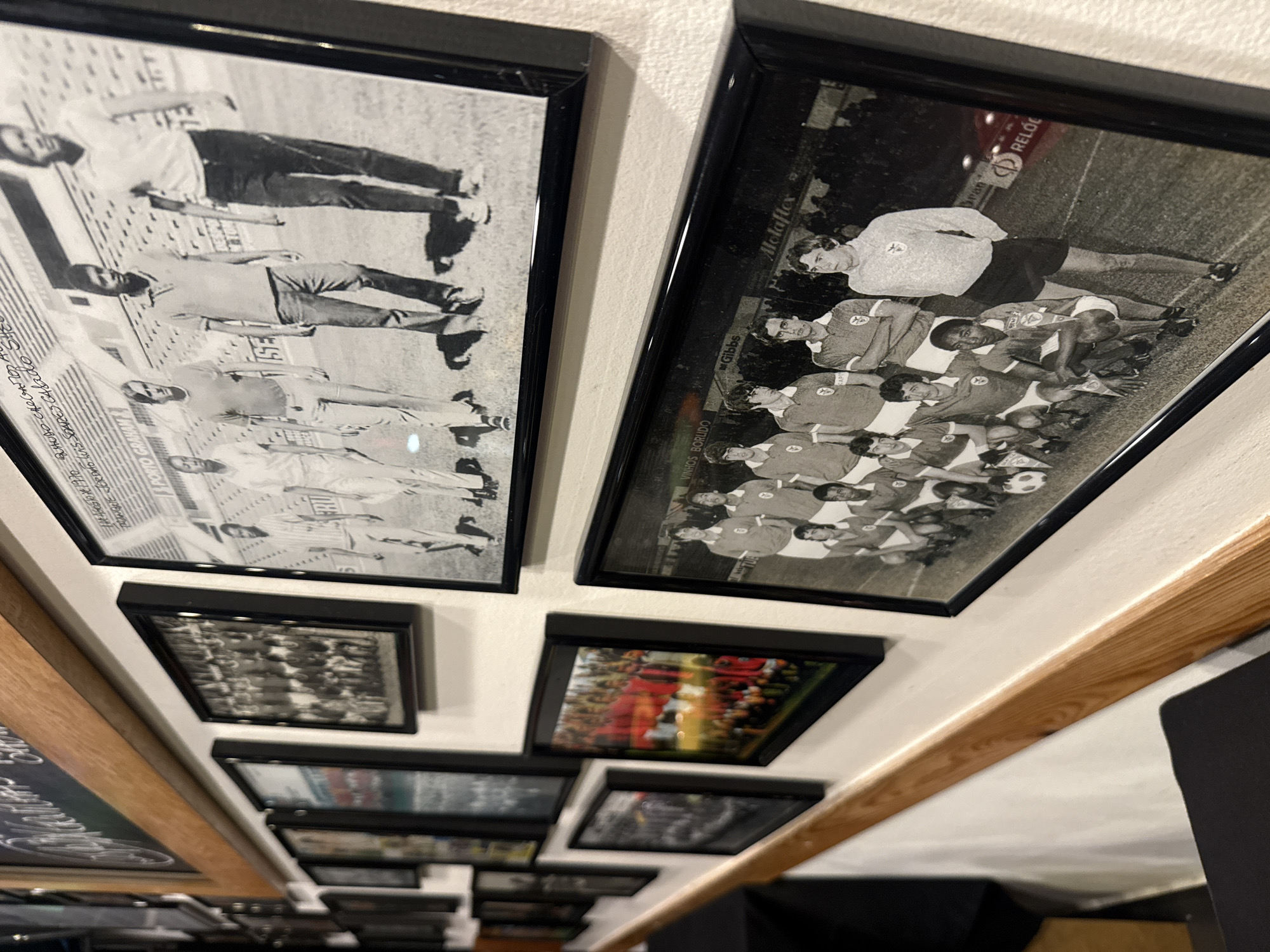 The image displays a white wall within a building in Loures, Portugal, adorned with numerous framed photographs, predominantly in black and white. A large, dark-framed, black and white photograph in the upper right quadrant depicts four men in casual attire walking across a football pitch, with stadium seating visible in the background featuring text such as "PORTO GRAHAM." Handwritten text in the upper left of this photo includes "1976." Below this, a second large, dark-framed, black and white photograph shows a football team in uniform, with several players standing and others kneeling on a grass field. These players wear light-colored jerseys with a dark emblem. Advertising hoardings in the background include "VINHOS BORUDO," "Gibbs," "Melaftex," and "RELÓG." A dark-skinned player is prominently featured in this lower photograph, kneeling in the front row. To the left of these prominent images, a series of smaller, mostly out-of-focus framed photographs extend along the wall, depicting various groups, likely sports teams, and one colored image shows a crowd in red attire. A wooden frame borders the top of the wall, partially revealing a chalkboard with white chalk writing. A light-colored wooden rail or ledge extends horizontally across the lower portion of the image. In the immediate foreground, a dark, upholstered surface, possibly part of seating, is visible below the wooden rail. The scene suggests an interior space dedicated to displaying historical sports memorabilia, likely football-related.