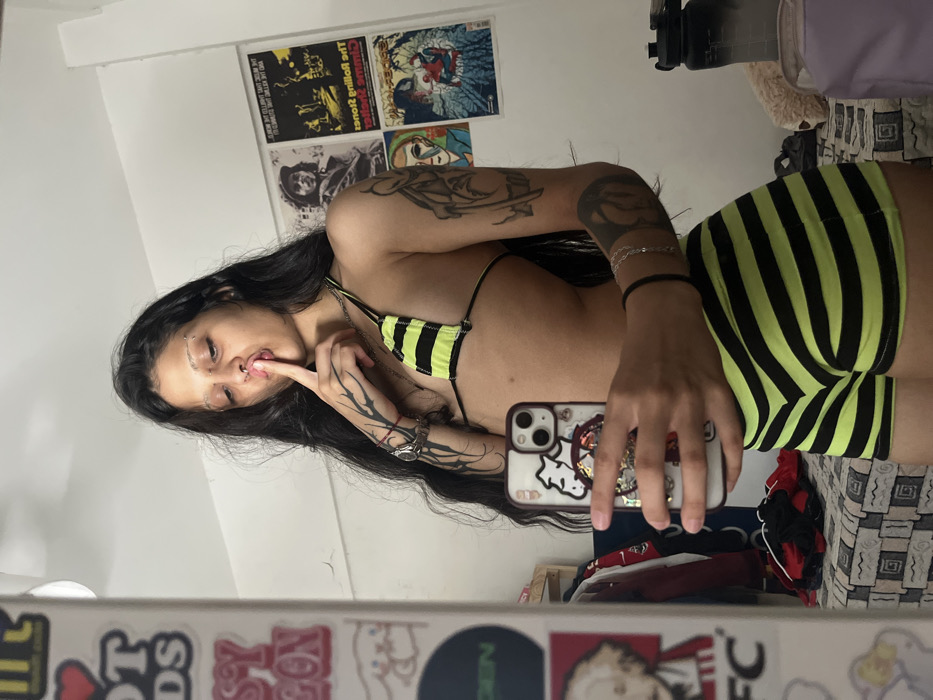 A woman poses in a mirror selfie wearing a black and neon green striped bikini top and shorts. She has long, dark hair and several tattoos on her arms and hands. She's holding a phone with stickers on the back, obscuring part of her face. The background includes posters on the wall, and personal items like clothes. The mirror's frame has stickers along the bottom edge.