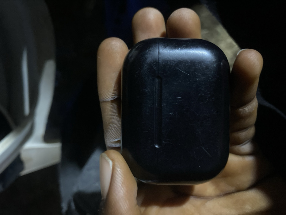 A dark-skinned hand holds a black, rectangular electronic charging case with rounded corners. The case, consistent in appearance with an Apple AirPods Pro charging case, displays numerous fine scratches and scuffs across its surface. The thumb and fingers of the hand are visible, supporting the case. The background is dark and out of focus, with indistinct lighter shapes in the upper portion suggesting an indoor setting under low light conditions. The scene is located in Barakin Lerawi, Nigeria.