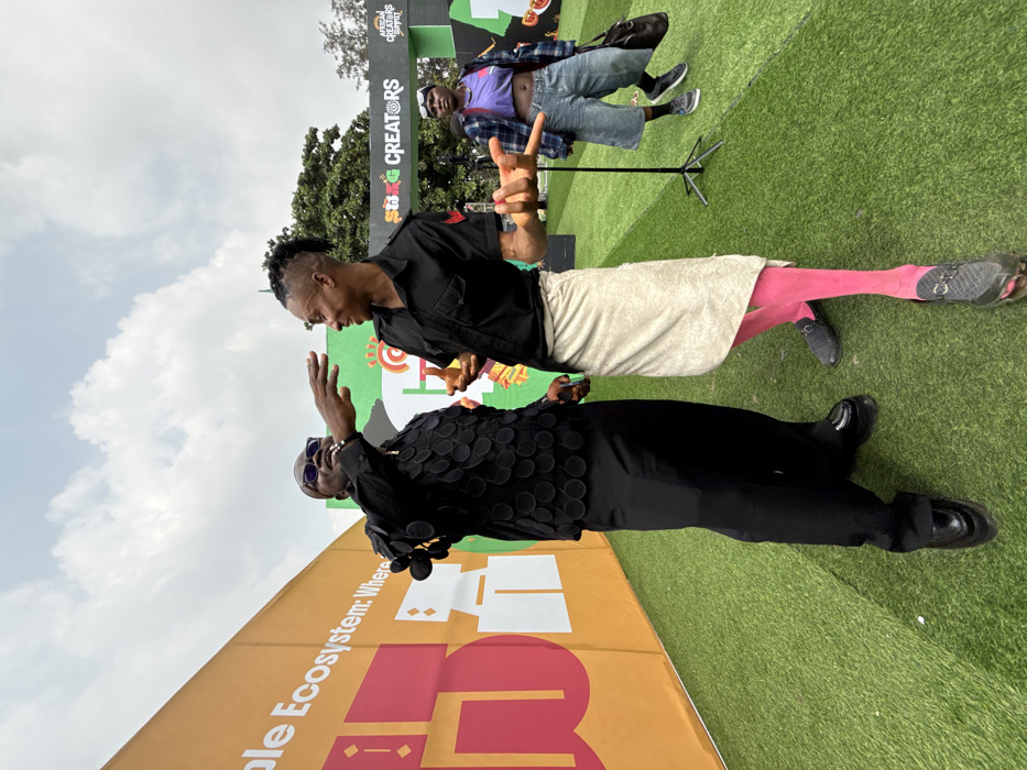 An outdoor scene in Itirin, Nigeria, features three individuals on artificial green turf, positioned in front of a series of event banners under an overcast sky. In the foreground, a dark-skinned male on the left wears black sunglasses, a black shirt adorned with numerous circular fabric appliques, black trousers, and black dress shoes; he gestures with his right hand towards the center while smiling. Adjacent to him, a dark-skinned male with dreadlocks and shaved sides wears a black short-sleeved shirt with a red insignia, a light beige fabric wrapped around his waist, bright pink leggings, and dark slip-on shoes; he gestures expressively with both hands. In the mid-ground on the right, a third dark-skinned individual wears a purple crop top, an open blue plaid shirt, and light blue denim shorts, carrying a dark bag and observing the foreground interaction. Banners in the background display text including "...able Ecosystem: Where...", "STKG CREATORS", and "AFRICAN CREATORS SUMMIT". Green foliage is visible beyond the banners.