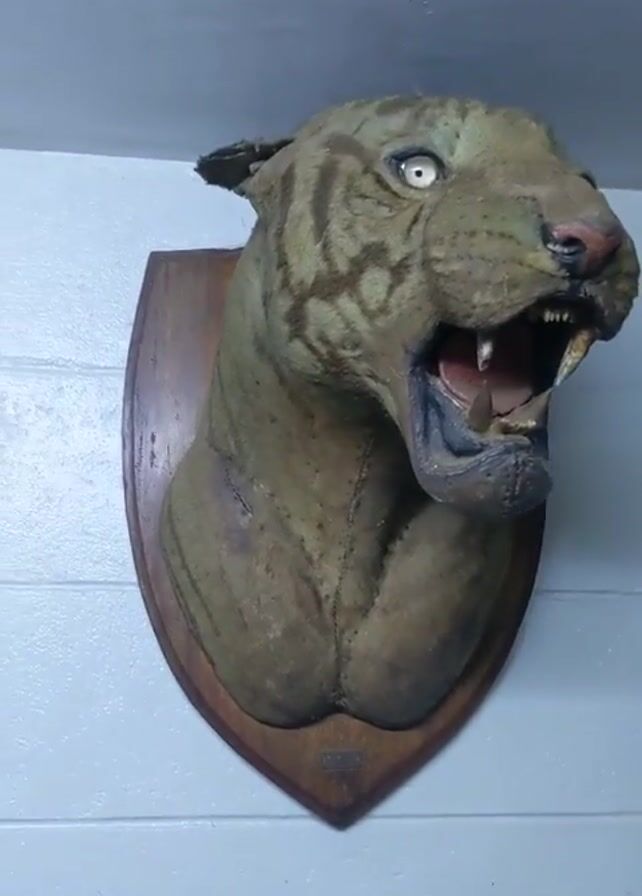 - "taxidermied head of a large cat, possibly a tiger or lion, mounted on a wooden shield" by FM-QrecA3, licensed under CC BY 4.0