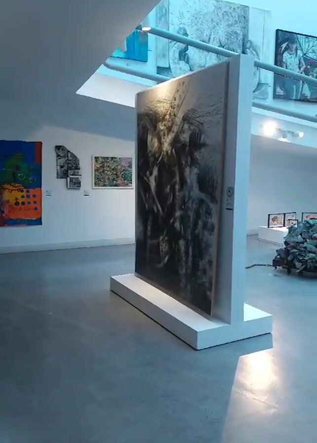interior of a modern art gallery. There are various paintings and sculptures on display, arranged on the main floor and a higher level accessible by a ramp. The artwork ranges from colorful abstract paintings to black and white drawings and mixed media sculptures. The gallery has a modern, airy design with a skylight and a concrete floor. A person is visible walking on the upper level in the background. The lighting is bright, giving the gallery a clean and professional appearance.
