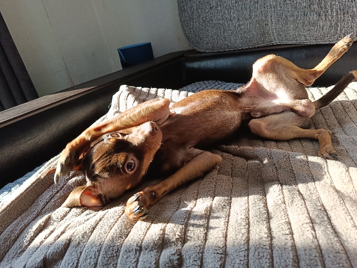 An indoor scene in the city of Фоки, Russia, depicts a small, short-haired dog lying on its back. The dog, exhibiting brown fur with lighter tan markings on its underside and limbs, is positioned in a twisted posture on a light grey, ribbed-textured blanket. Its head is turned upwards and slightly to its left, with dark eyes directed towards the viewer. One foreleg is bent and raised, partially covering the top of its head, while the other foreleg is bent near its chest. The dog's abdomen and groin area are exposed, and its hind legs are splayed, with the left hind leg bent at the hock and the right hind leg extended. The blanket rests on a dark-colored sofa or chair, a portion of which is visible along the left and upper edges of the frame. In the upper background, a light-colored wall is present, behind which a small, dark blue rectangular object is visible on an elevated surface. Direct sunlight enters from the left, casting prominent parallel shadows across the blanket and illuminating parts of the dog.