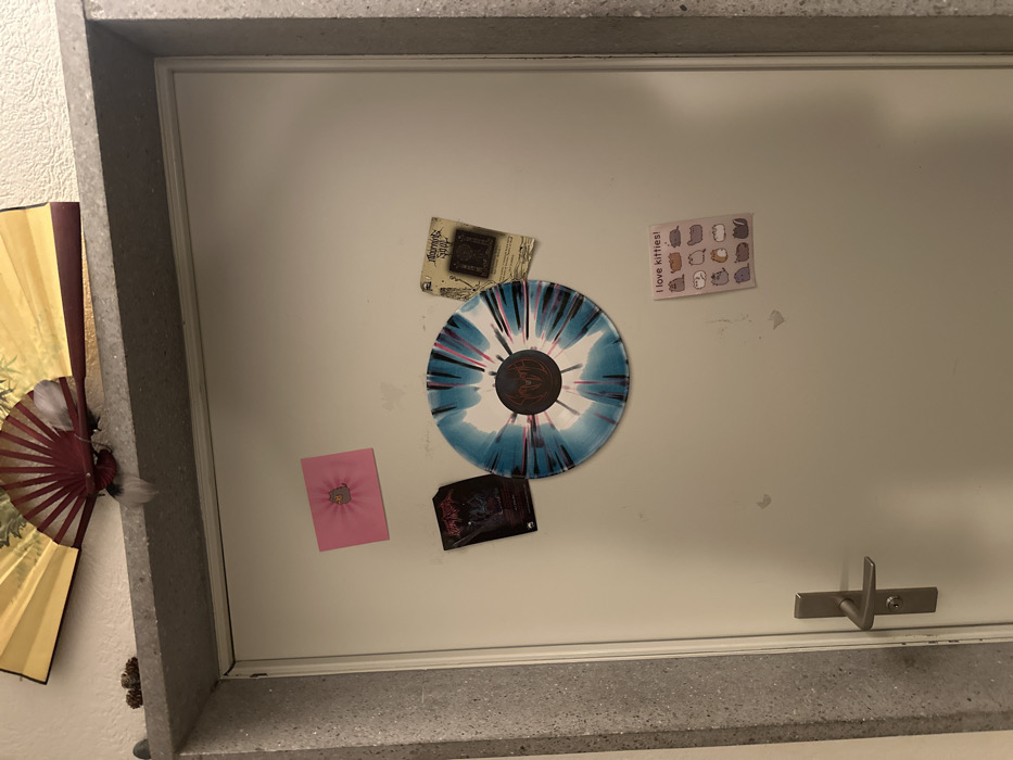 The image displays a white interior door, framed by a light grey, speckled stone or concrete door frame. Above the door frame, a decorative golden-yellow and reddish-brown folding fan is mounted, with a small white feathery ornament hanging from its lower edge. To the left of the fan, a small, dark, textured object, possibly a dried plant piece, rests on the top of the door frame. Attached to the white door are several decorative items. On the upper left, a pink square note or sticker depicts a cartoon cat (Pusheen) emanating lines. Below this, a dark, rectangular graphic print, resembling an album cover, displays intricate, possibly metal-themed, artwork. Central on the door is a circular object resembling a vinyl record, featuring a vibrant splatter pattern of white, light blue, dark blue, and pink, radiating from a black central label with a red, stylized symbol. To the right of this record, an aged or discolored rectangular print or card, possibly album art, shows detailed black line illustrations and partially visible text, including "Alchemist's." On the lower right of the door, a rectangular sticker sheet or print features the text "I love kitties!" above a grid of small, cartoon cat illustrations. The door is equipped with a modern, silver-toned lever handle and a keyhole located on its left side. No individuals are visible. The specific location within Wetzikon (ZH), Switzerland, cannot be determined from the visual information provided.