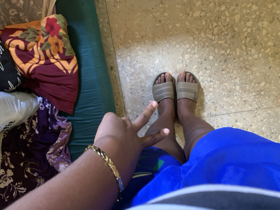 An indoor scene is observed from a high-angle perspective, focusing on the lower body and right arm of an individual. The individual, presenting with medium to dark skin tone, wears blue shorts and light brown slide sandals. A gold-colored link bracelet adorns the right wrist. The right hand displays a 'V' gesture with the index and middle fingers extended downwards, the index finger pointing towards the individual's left foot. The feet are positioned on a light-colored, speckled terrazzo floor. In the background, behind the individual, a dark green upholstered surface, likely a sofa or bed, is visible. This surface is partially obscured by a pile of textiles, including a dark purple patterned fabric, a white plastic bag, and a maroon fabric with an orange and green floral pattern. The precise location within Maigizo, Nigeria, is not ascertainable from the visual evidence.