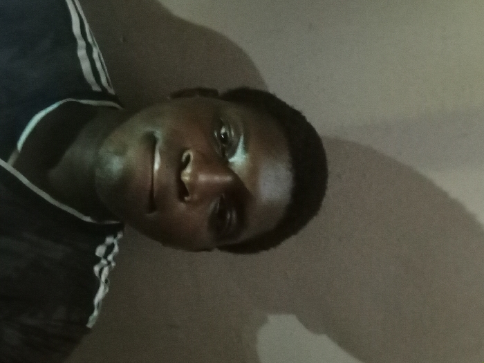 A close-up shot of a person with dark skin is presented at an unusual angle. The individual is wearing a dark top with white stripes along the shoulder or sleeves. The face is well-lit and slightly blurred, featuring a prominent nose and a gentle smile. The hair is short and dark. The background is a neutral wall with a shadow cast, possibly from the subject or another object in the room. The lighting is somewhat uneven, with one side of the face brighter than the other.