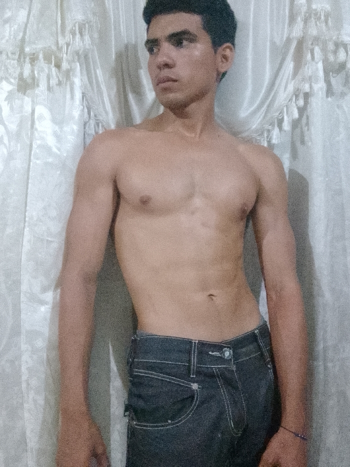 A slender, bare-chested young man with short, dark hair stands facing slightly left. He wears dark jeans with light stitching. He has visible abdominal muscles and definition in his arms and chest. A bead bracelet is visible on his right wrist. A crinkled, white curtain is behind him. The lighting is soft, creating shadows on his skin and adding texture to the background.