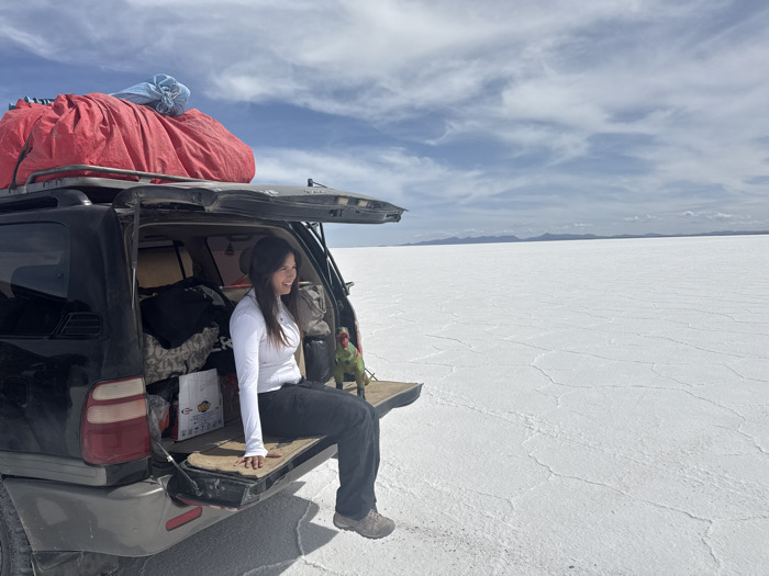 A single female individual is depicted seated on the open tailgate of a dark-colored SUV, parked on a vast, flat white salt plain, identified as Salar de Uyuni within Municipio Colcha K, Bolivia